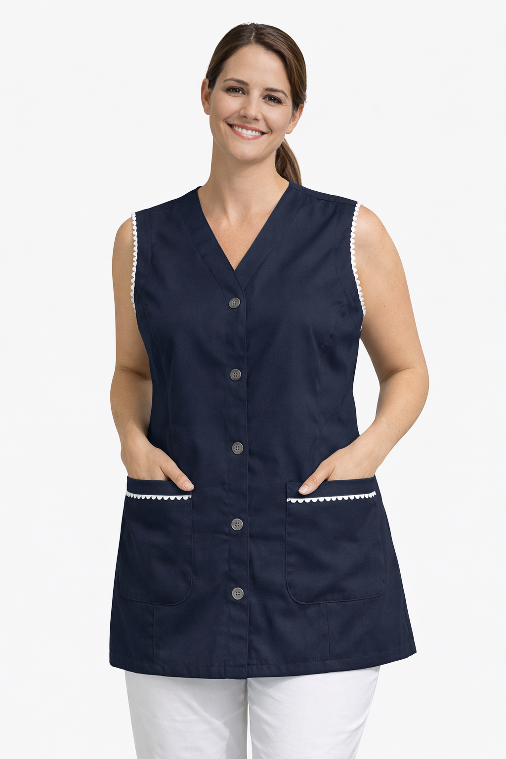 Possui decote em V, fechamento frontal por botões e bolsos funcionais com acabamento em cor branca, que trazem um toque de charme e sofisticação ao uniforme.